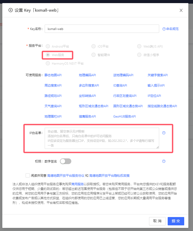 key类型如下,(建议:白名单可以后面再配置,等功能通了再配置)