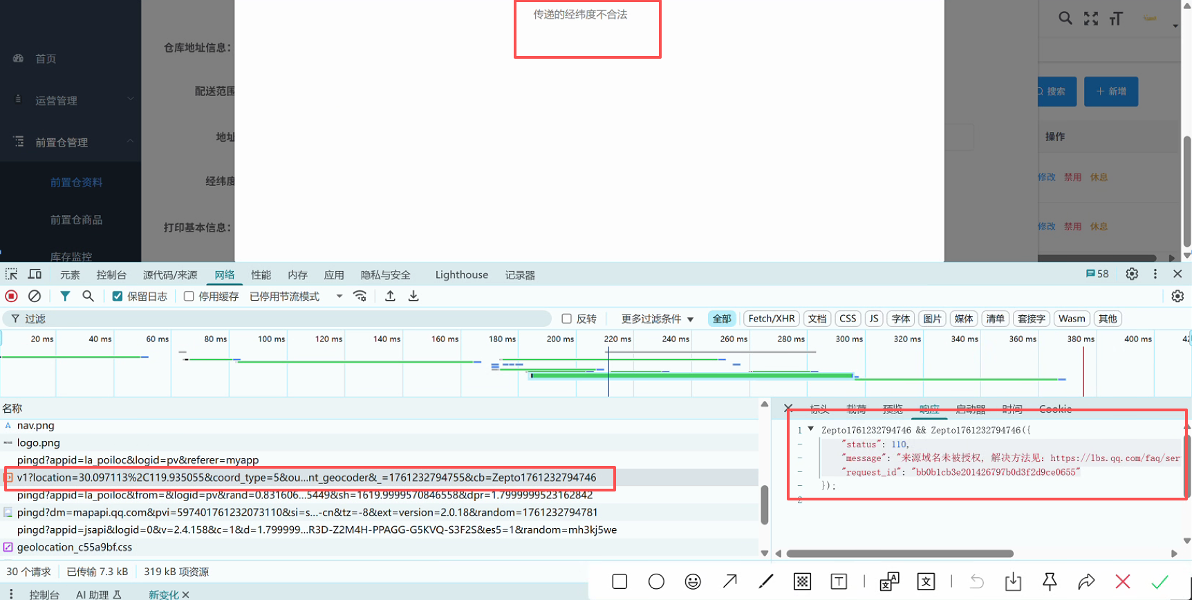 路径:前置仓管理 → 前置仓资料 → 编辑/新增前置仓 → 点击解析