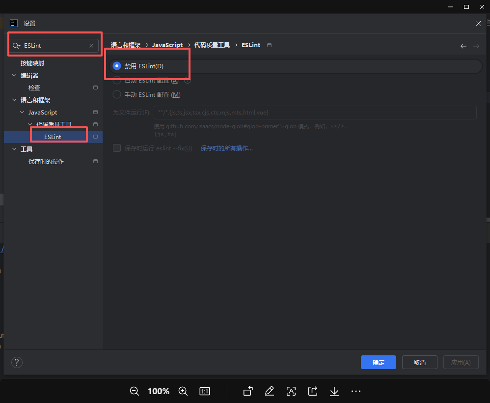 - 如果需要重新开启 ESLint 校验,只需按照相同路径重新启用即可